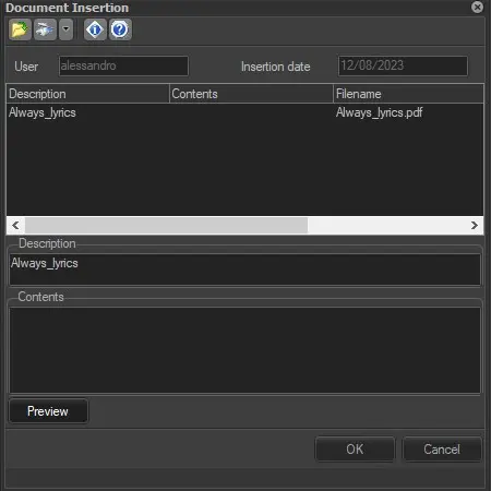 Moreover, the "Document Insertion" window also allows compiling the following information on the virtual document: