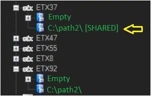 In the cloud device, the path with the shared volume path is indicated with the suffix [SHARED] on the path name.