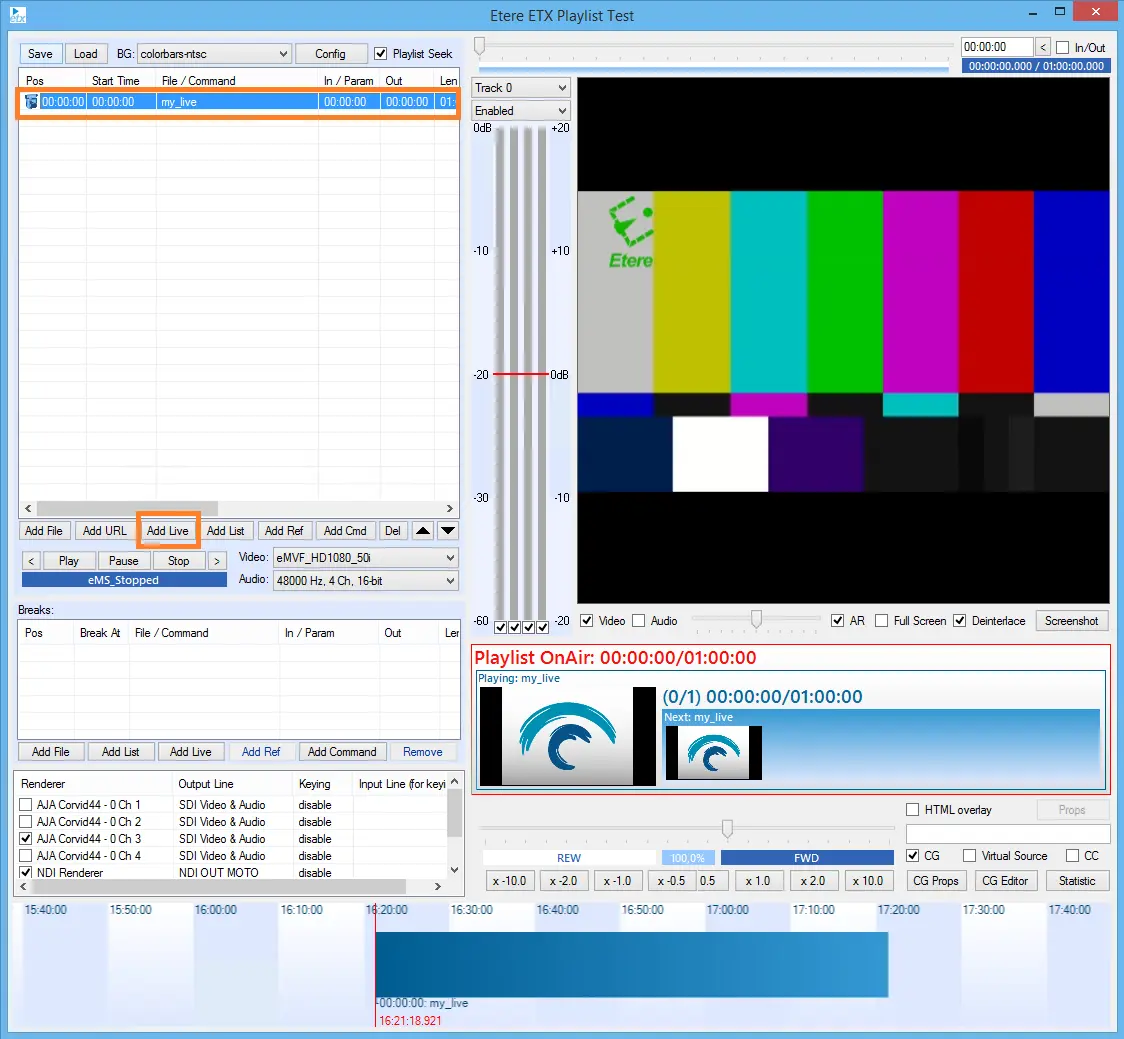 Right after pressing the Add Live button, a new record in the Playlist Panel will be created: