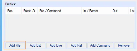 By pressing the <Add File> Button on the Breaks Section, it is possible to add any break, for instance, Commercial Breaks, to any given playlist.