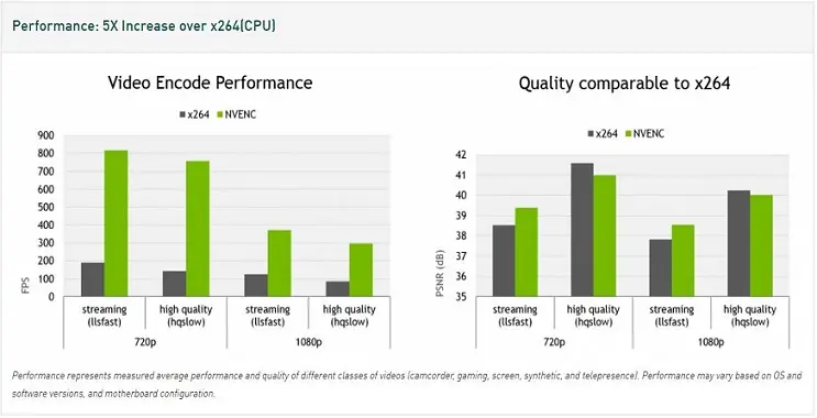 Performance NVIDIA's latest generation of Graphics Processing Units (GPUs) based on the Kepler and Maxwell architecture contain a hardware-based H264 video encoder. It is commonly referred to as NVENC.