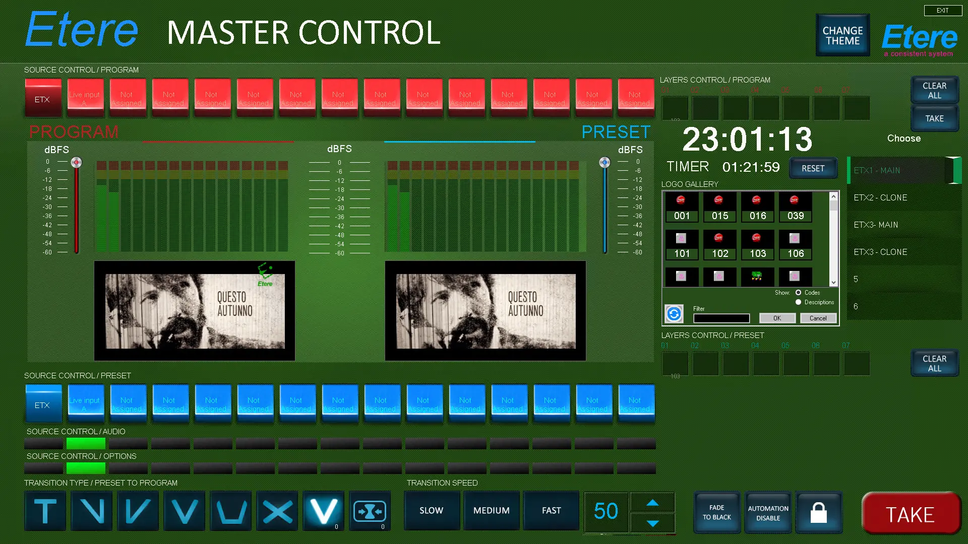 The Change Theme button at the top right corner of the Etere Master Control Panel allows you to change the background colour of the desktop displays.