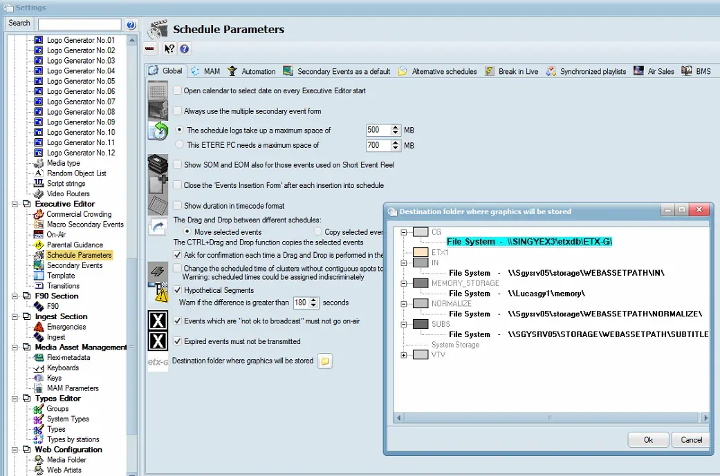 After graphics are imported into the Etere Ecosystem, the graphics are stored in a single repository specified in the global parameter in Etere Configuration > Settings > Executive Editor, under the global parameter "Destination folder where graphics will be stored".