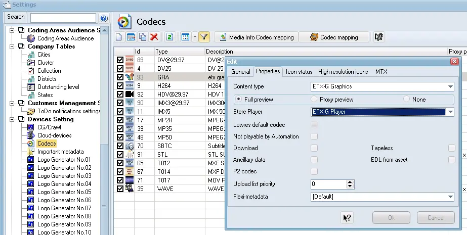 Launch theEtere Configuration module and navigate to Settings > Devices Settings > Codecs, right-click on the ETX-G resource, and select the Properties tab; in the <Etere Player> parameter, it must choose ETX-G Player as the codec type to be used.