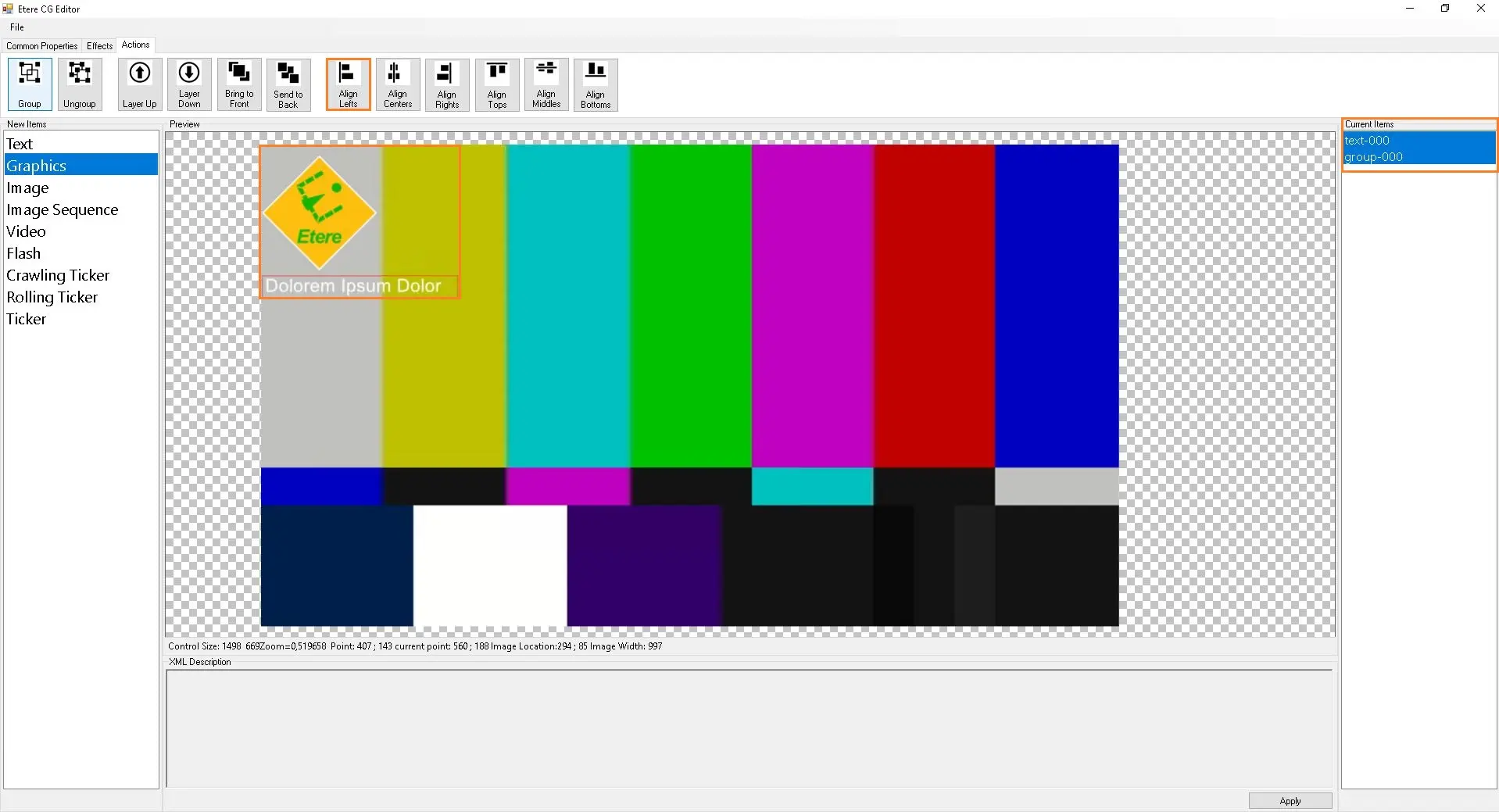 The group button allows you to group more than one item type as one selection. Item type can be text, Graphic, image, flash, image sequence or tickers. Grouping of items allows you to modify them with a single action.