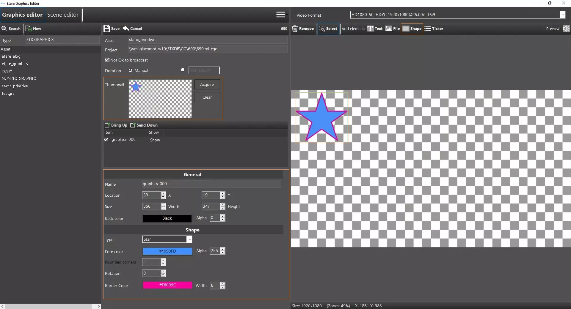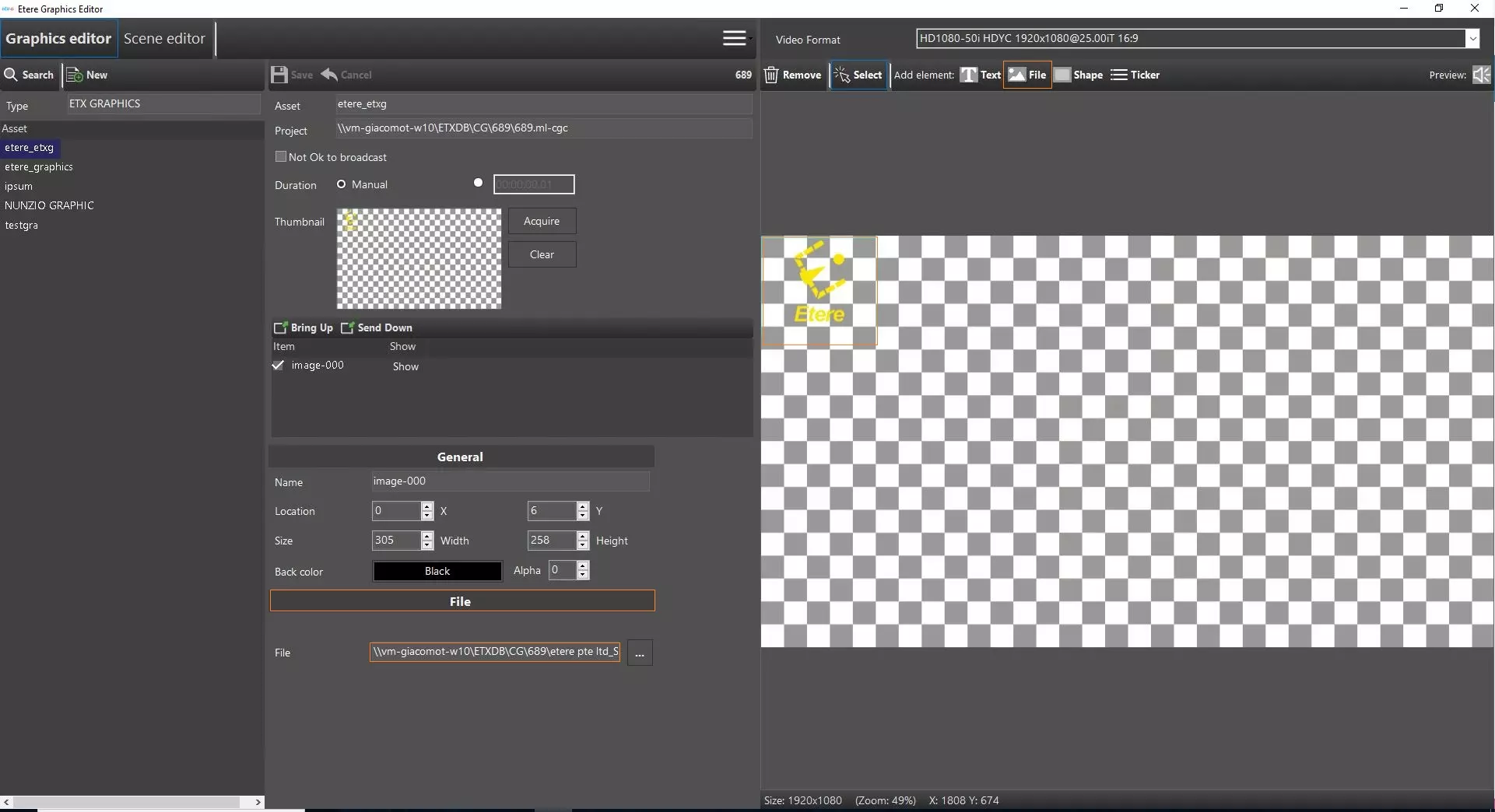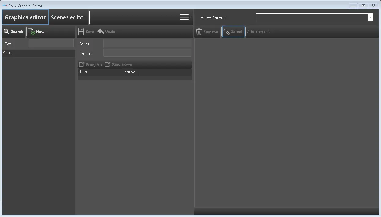 ETX-G Graphics Editor allows you to create and edit Graphics objects and scene projects in Etere ETX-G. You can launch the application using the shortcut Etere Graphics Editor in the Windows Start Menu or the Windows desktop.