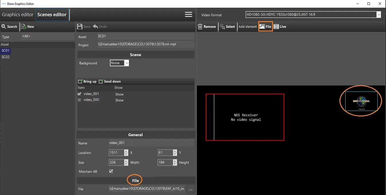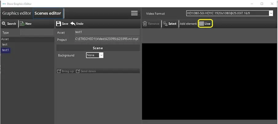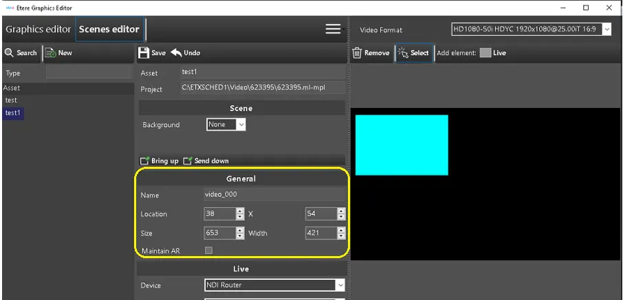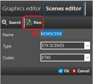 In Scenes Editor, you can create new scene assets or modify existing assets in a similar way as described in Graphics Editor. Before creation, an asset type property, "ETXS", must be defined in the "Type" properties.