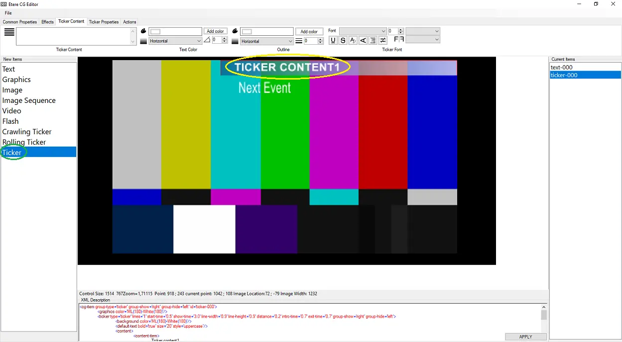 Click on the “Ticker” item in the New Items list, drag and drop an empty ticker layer into the Preview window, and enter “Ticker Content 1” in the ticker content. You can adjust the ticker position, size, and background colour with the features provided in CG Editor.