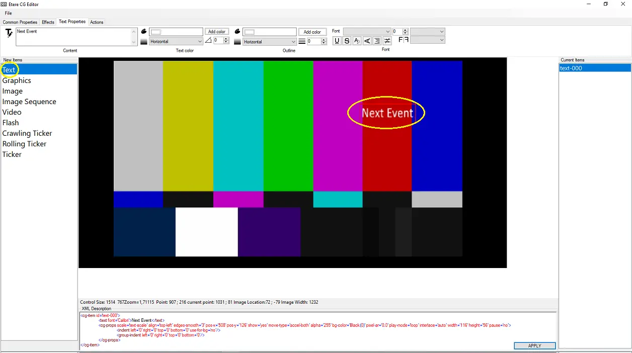 Click on the “Text” item in the New Items list, drag and drop the text layer into the Preview window, and enter “Current Event” in the text content. Etx-g_current_event_1