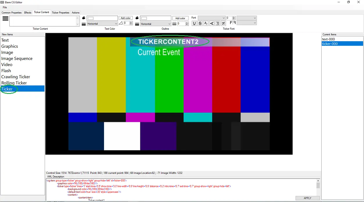 Next, click on the “Ticker” item in the New Items list, drag and drop an empty ticker layer into the Preview window, and enter “TickerContent2” in ticker content. You can adjust the ticker position, size, and background colour using the features provided in CG Editor.