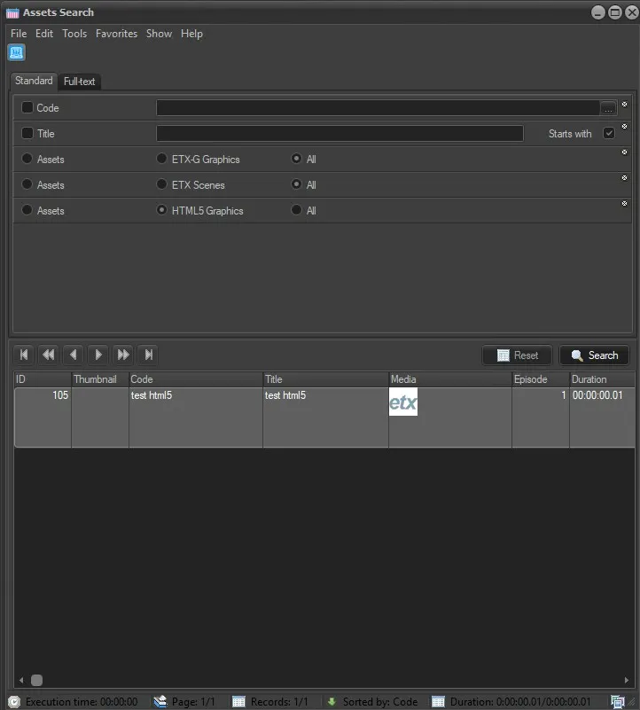 Click on the “ETX-G” tab ,click on Template to launch the asset search form and select the ETX graphics object you want to add as secondary event between Graphics, Scenes or HTML5 Graphics (if the filters are not present you can add them by right click on "standard" tab > add filter > search filter and check for "etx" filters and "html5" filter)