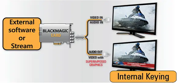 Internal Keying In Internal Keying mode, an external software or external stream will set the Blackmagic card to superimpose the graphics over the incoming signal, as illustrated in the image below.