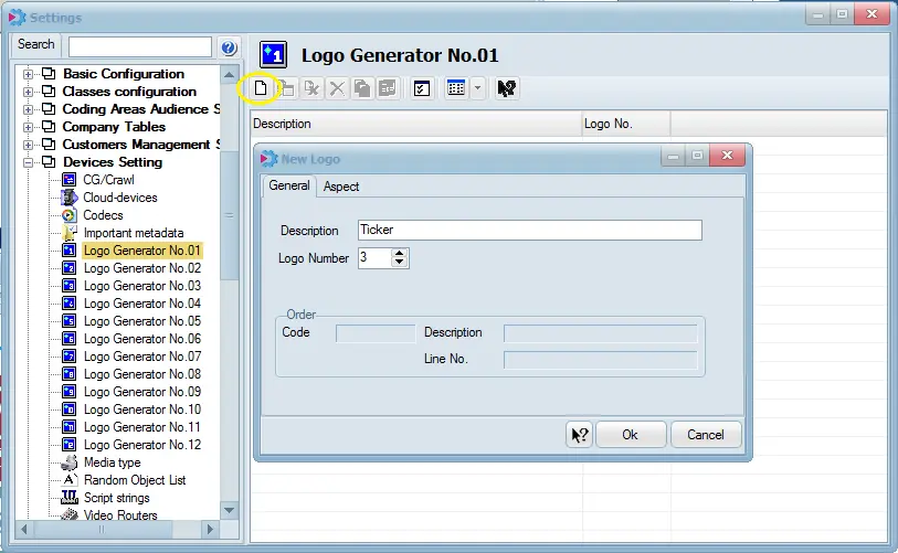 Add a new Logo. Launch the Etere Configuration module and access Settings > Device Settings > Logo Generator No. 01