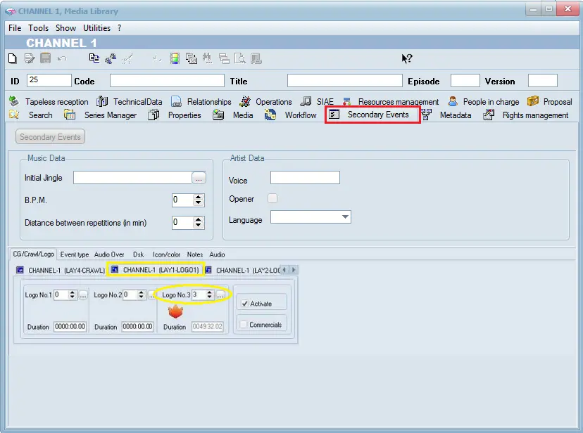 Click the <New> icon to create a new logo, enter the logo description and select Logo Number “3” corresponding to the template filename (003.ml-cgc) created in the previous step. Click <OK> to confirm the creation of the new Logo. Next, add the new logo number to the Secondary Events tab in the Media Library, as shown in the image below. The new Logo is set as Logo No. 3 in Layer 1. Nunzio_main_news_ticker_ml