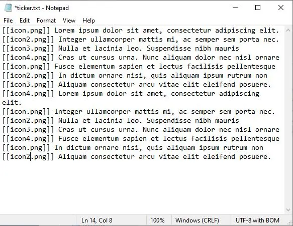 Create a ticker text file. Next, create a ticker text file (i.e. Ticker.txt) that contains the text to be displayed on-air, as shown in the sample below.