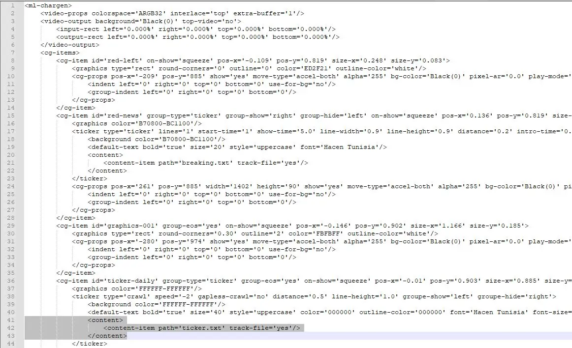 Create a template containing the crawl ticker. First, create a template file that determines how the crawl ticker would display on-air. The extension of the template file must be .ml-cgc (i.e. Ticker. ml-cgc). A sample of the template file is captured below for reference.