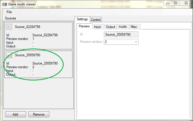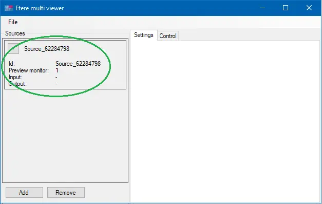 In the <Settings> tab, you can insert input source to Multiviewer by clicking on the <Add> button at the bottom panel.