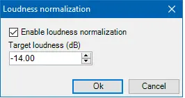•Target loudness (dB): If loudness normalisation is enabled, set a loudness unit to normalise the loudness to a target level. For example, when the reference normalise level is set at -14.00 LUFS, if a program is analysed to be -10.00 LUFS, the level would be lower by 4 dB to match the target loudness of -14.00 LUFS.
