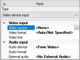 - Video device input: Several kinds of Video sources are available (SDI boards, NDI streams, webcams and other) from the Video source drop down list. The remaining parameters depend on the selected video source.