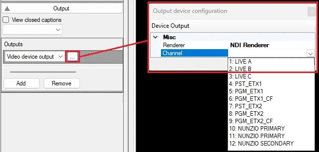 - Outputs: Clicking on the Add button, it's possible to configure multiple outputs. Network stream and video device output kinds are available. Clicking on the button beside the droplist, different properties will be shown, according to the kind of output selected.