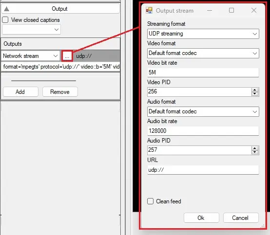 - Network stream: A network stream. Target IP and port can be set in the Udp field, stream parameters can be set in the Parameters field.