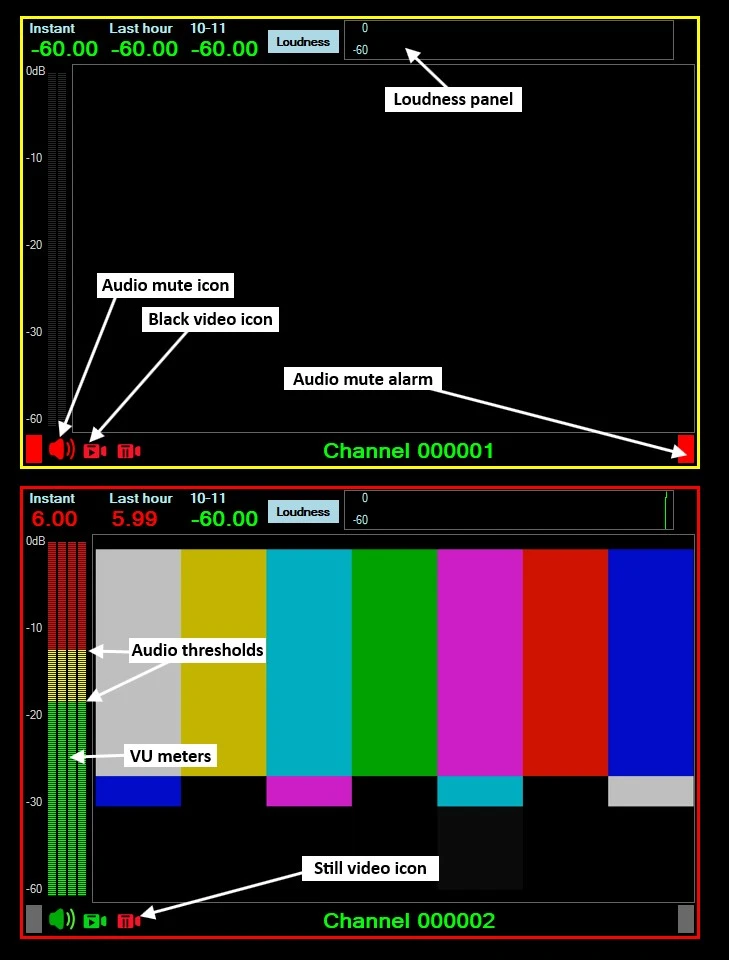 - Audio thresholds: allow definition of two audio levels which affect visualization of audio on the Multiviewer monitor VU-meters: audio below the Yellow value will be displayed by green bars, audio between Yellow and Red values will be displayed by yellow bars, audio over Red value will be displayed by red bars.