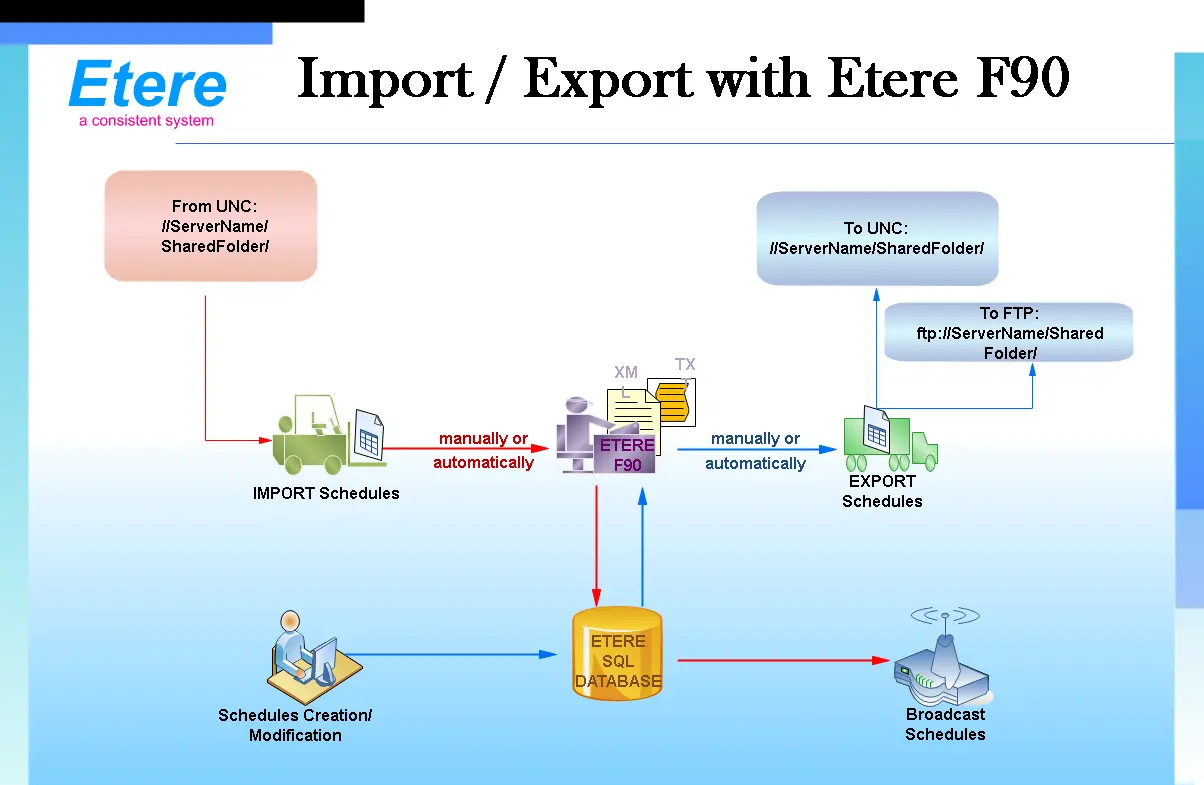 Etere F90 can import schedules to the main DB from a PC by setting a UNC path and export data from the main DB to a PC by setting a UNC path or to an FTP Server. Moreover, Etere F90, using information technology tools (such as VPN), allows a simple and safe way to send or receive data.