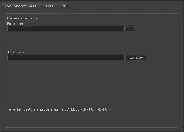 This automatic Export is based on Etere Scheduling's manual Export EXPORT\STANDARD\APPLEFCPXML; therefore, required export-specific parameters are unavailable here but must be configured in the manual Export.