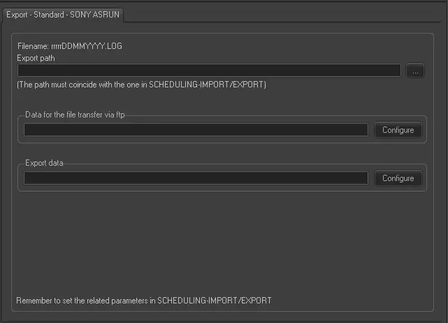 Export Path (leave it blank, not to export it) - Required only if you intend to save the exported file to a computer in your network. This path must coincide with the one set in Etere Scheduling > Import/Export.