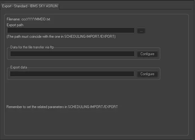 This automatic export is based on Etere Scheduling's manual export called IBMS SKY ASRUN; therefore, the required parameters that are not available here must be taken from the manual export.