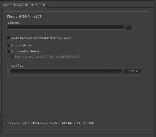 The F90 – Import Standard RCS Deferred import, allows configuring and performing the import of deferred commercials, that is, the import of commercials which weren't available during a previous import and which are intended to be imported in a second instance.