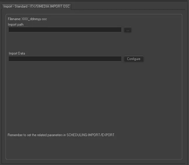 Set the required parameters in Etere Scheduling > Import/Export > IMPORT\STANDARD\ITX/SIMEDIAOSC and confirm the changes clicking on [Save parameters] once done.