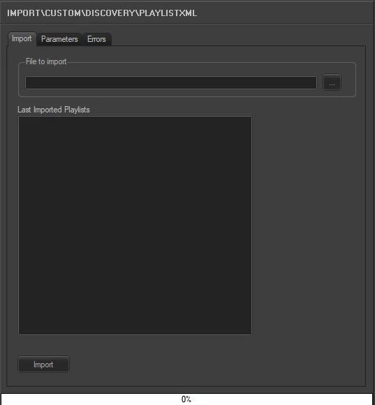 The DISCOVERY PLAYLIST XML import has been developed to help DMAX on importing broadcast playlists. It allows to import an XML file named as "xxxDDMMYYYY.xml" (e.g. ABC30112013.XML) which contains data related to a certain daily playlist, where 'xxx' is a custom optional prefix inserted by the user.