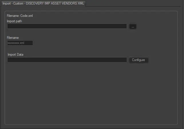 The F90 – Import Custom DISCOVERY IMP ASSET VENDORS XML allows to import an XML file containing data related to asset.