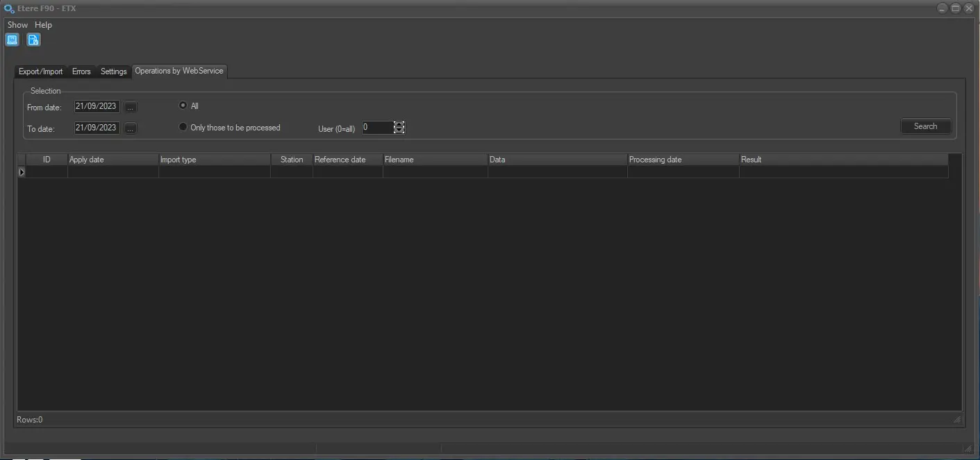 Once the import is completed, if other requests are in the queue with the "From WebService" checkbox checked, the F90 module will impose a 10-second interval loop to search for the next file to import. The processed requests can be found in the "Processing Date" column with the date and time of the request being processed, and the import status can be found in the "Result" column.