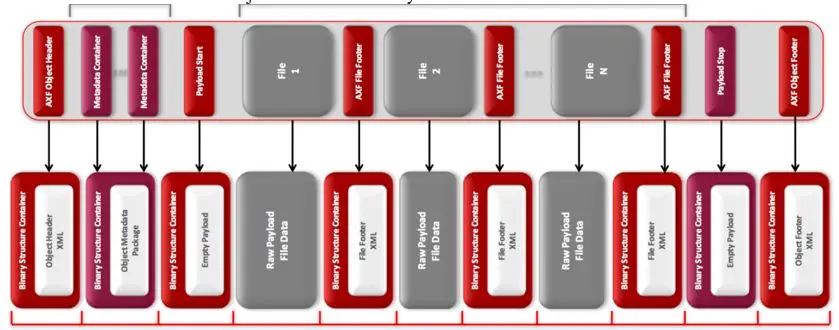 It is the actual byte data of the files encapsulated in the objects. The payload consists of any number of triplets – file data, file padding, file footer. File padding ensures alignment of all AXF Object elements on storage medium block boundaries, it is key to the AXF specification. The File Footer structure contains the exact size of the preceding file, along with file-level checksum designed to be processed on-the-fly by the application during restore operations with little or no overhead. These file footers add to the enhanced resiliency of AXF as they can be used to recover file payload data even if the AXF Object Header and Footer structures are missing or corrupt.