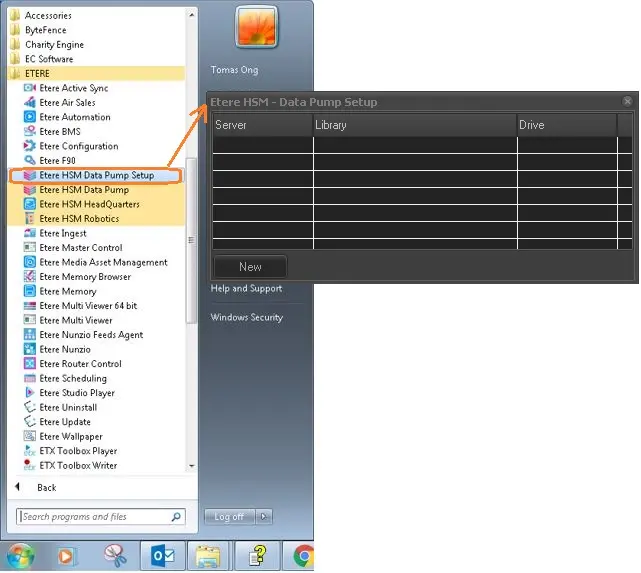 The Etere Data Pump server(s) must be configured in the PC where the tape drive is connected. In order to configure a new Etere Data Pump, simply launch the Etere HSM Data Pump Setup from desktop Start Menu: