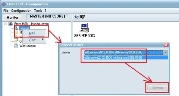 To add a Clone Headquarters, simply right-click on the HSM Server and select <Add> to open a server connection dialogue, select the Server to be assigned as Clone Headquarters and click the <Connect> button to establish a connection to the Server.