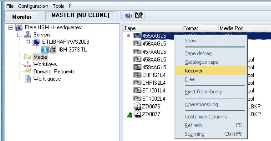 1.In Etere HSM - Headquarters > Media, right click on the tape marked as “unusable” and select “Recover” from the menu to start recovery the tape media.