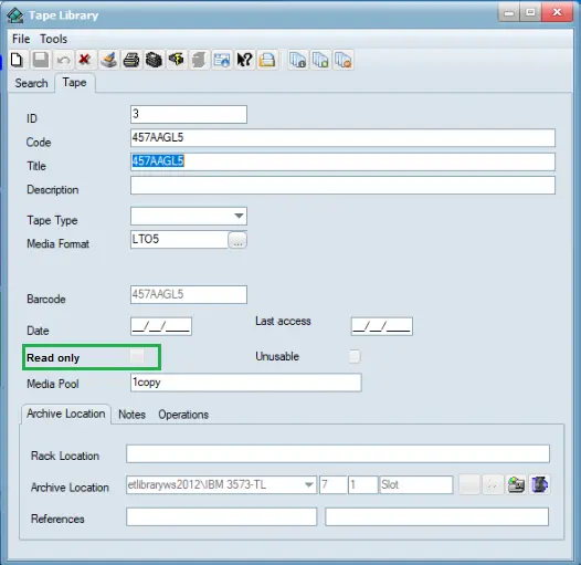 NB: Please note that in case the tape is online (i.e. not offline), the "archive location" field will be disabled and it won't be possible to modify it.