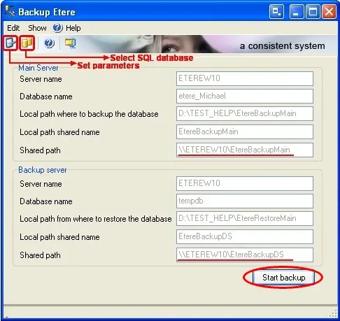 •By clicking on the 'Set parameters' button will be allowed to set the shared path where the backup file will be stored, it is recommended to set the same path used in the copies path field in Etere HSM, so the database will be ready to be archived by Etere HSM.