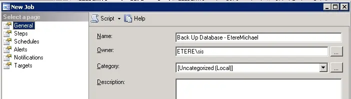 Instead, if you wish to schedule the just created 'database backup operation', select 'Script action to job' from the 'Script list', the next window will appear: