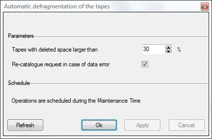 The "Automatic defragmentation of tapes" is a function that definitively removes all logically deleted files from tapes. This operation starts from the tape with more 'logical deleted space'. The automatic defrag will process all tapes with a deleted space larger than the specific percentage specified by the user.