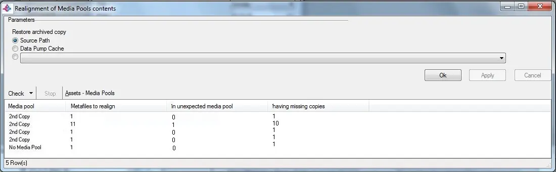List all media pools related to assets archived "in wrong media pools" and "with missing copies". For each media pool it will be indicated the number of detected metafiles: