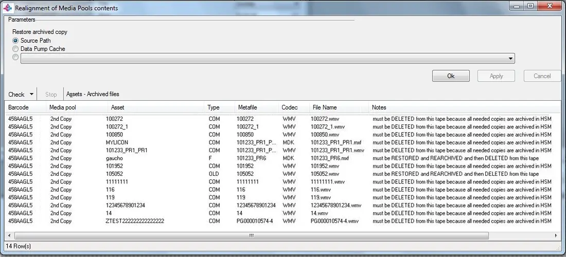In wrong media pools - The maintenance time operation will detect all metafiles (and memory files) which are currently stored in a wrong media pool (e.g. due to media pools changed data), that is, in a media pool different as the one(s) set by default. All detected contents which are stored on a wrong media pool will be processed (starting from the tape with more incongruent video clips) differently according to the following cases: