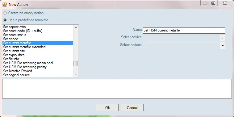2.Locate T-workflow action “Set Current Metafile”, provide a name to identify the action and indicate the device and codecs from the drop down list to archive the assets.