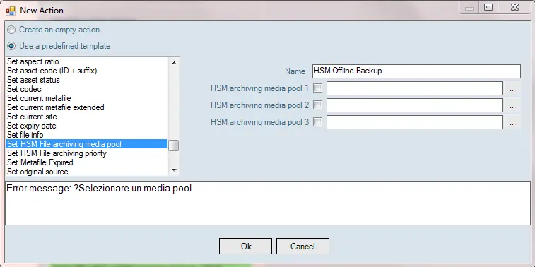 3.Locate the next T-workflow action “Set HSM File Arching Media Pool”, provide a name to identify the action and select the Media Pool dedicated for the archive operation.