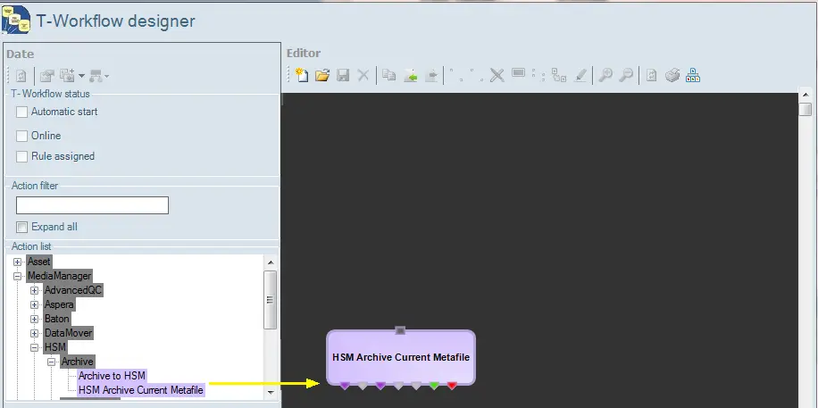 2.In Configuration Editor, launch T-workflow Designer and create an archive T-workflow “Upload to HSM” containing the “HSM archive on tape” action created in previous step.