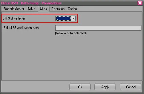 1. In the Configuration menu of Data Pump, you have to set the "LTFS drive letter" in the LTFS tab within the Parameters form.