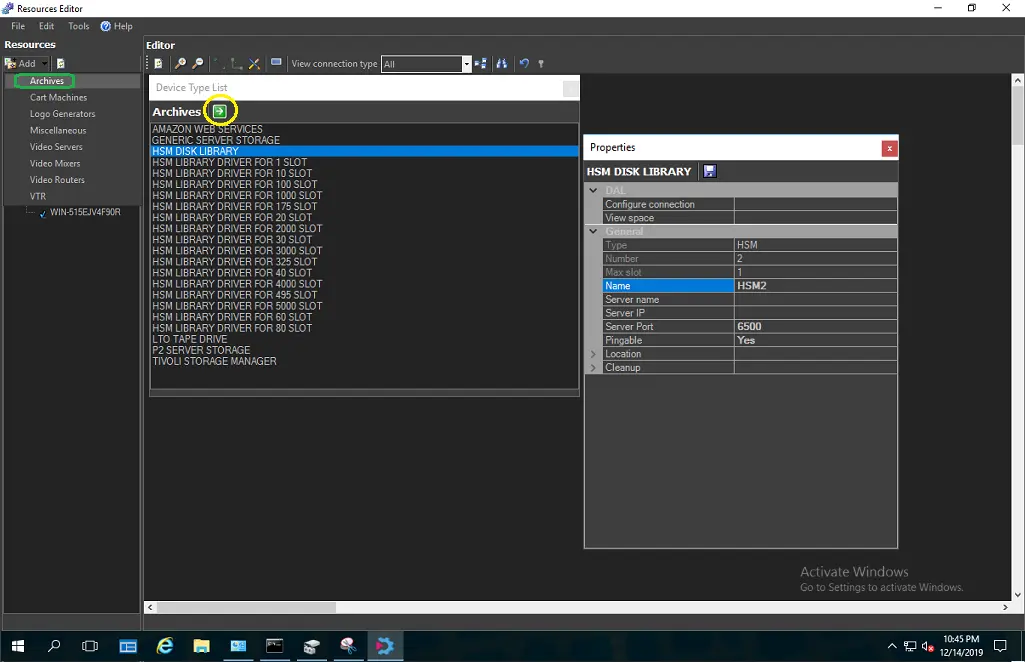 You can add HSM Disk Library resource to the resource list from Resource Editor module, simply click “Add > Archives” to display a list of available archival resources. From the list of resources, select “HSM Disk Library” and click the green arrow button to open the resource properties dialog box.